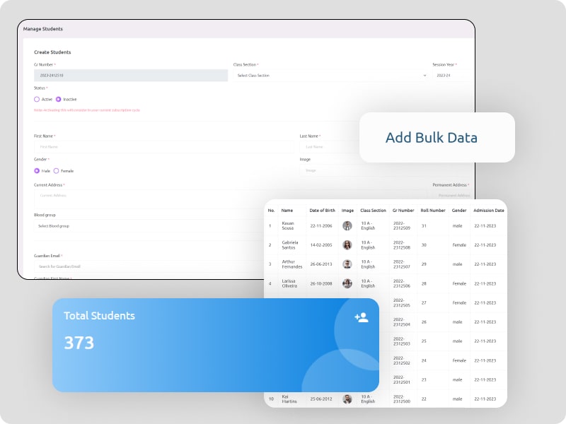 Our intuitive platform simplifies admission processes by enabling you to easily create admission forms, add students individually or in bulk, and efficiently manage parent details, ensuring a smooth and hassle-free enrollment experience for both staff and students.
