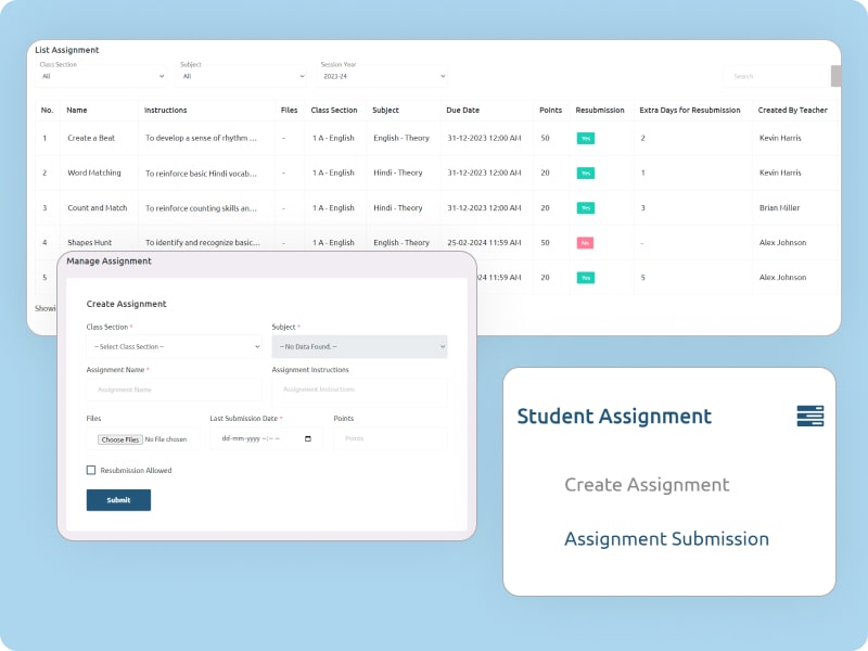 Our system allows educators to generate class-specific assignments with customizable weightage and resubmission options, while seamlessly managing submitted student lists to facilitate efficient grading and feedback, ensuring a streamlined assessment process.