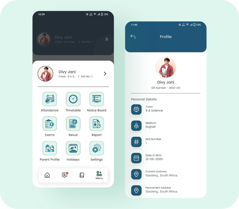 The VCC mobile app provides access to all essential school management tools within a single, convenient menu section, streamlining navigation and enhancing efficiency for teachers, students, and parents.