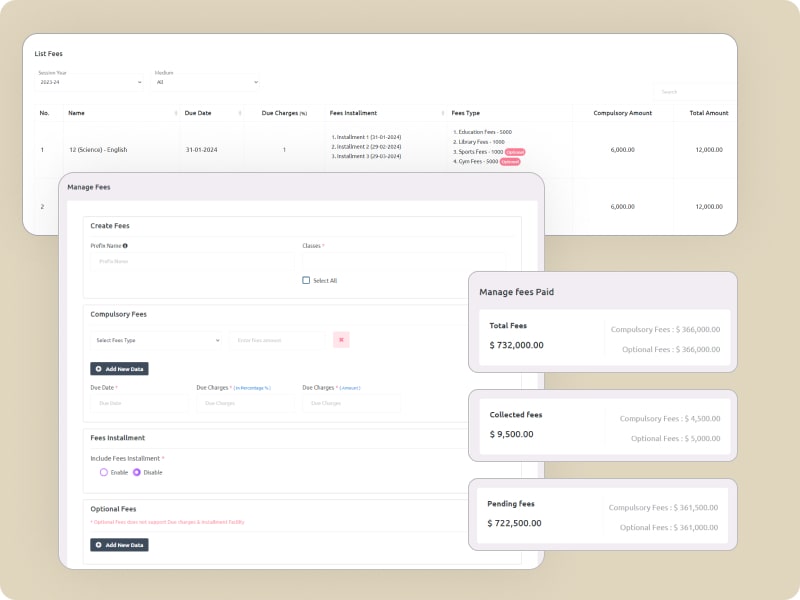 The Fees Management module streamlines the collection, tracking, and management of student fee payments, supporting various fee structures and payment modes.