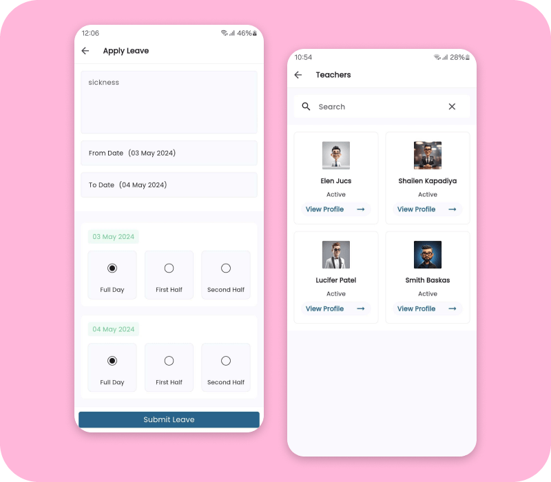 The Teacher Management module simplifies the administration of faculty information, including scheduling, attendance, performance tracking, and communication.