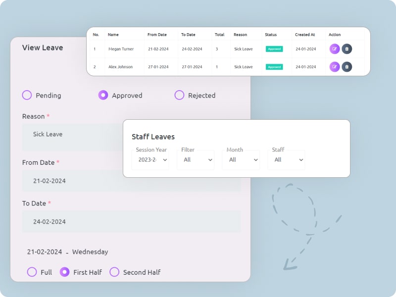 Leave Management for all employees, including teachers and staff, offers a dedicated section to easily track, approve, and manage leave requests, ensuring smooth operations, accurate record-keeping, and efficient handling of leave processes within the virtual learning environment.